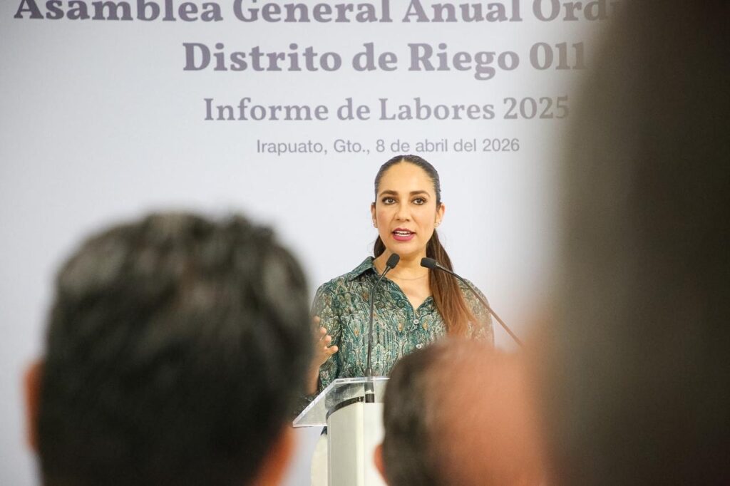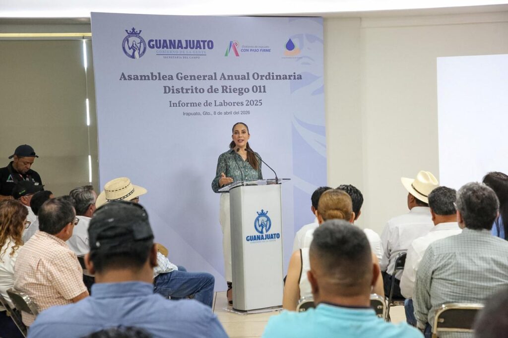 Irapuato, Gto. 8 de abril de 2026.- Con un llamado a la unidad y al trabajo conjunto, el fortalecimiento del campo se mantiene como una de las principales apuestas del Gobierno de Guanajuato, así lo expresó la gobernadora Libia Dennise García Muñoz Ledo durante su participación en el informe anual de actividades del Distrito de Riego 011 Alto Río Lerma.