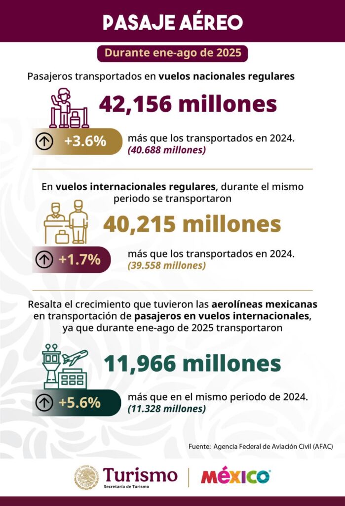 La secretaría de Turismo del Gobierno de México informó que, entre enero y agosto de 2025, se transportaron más de 82 millones de pasajeros en vuelos nacionales e internacionales en México.